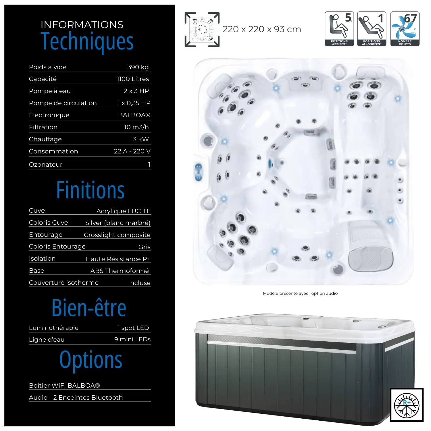 Spacieux et convivial, le SP3 est le spa 5 places conçu pour les instants de détente en famille ou entre amis. Grâce à ses dimensions de 200 × 200 cm et sa hauteur de 90 cm, il offre une belle capacité tout en s’intégrant facilement en extérieur comme en intérieur.