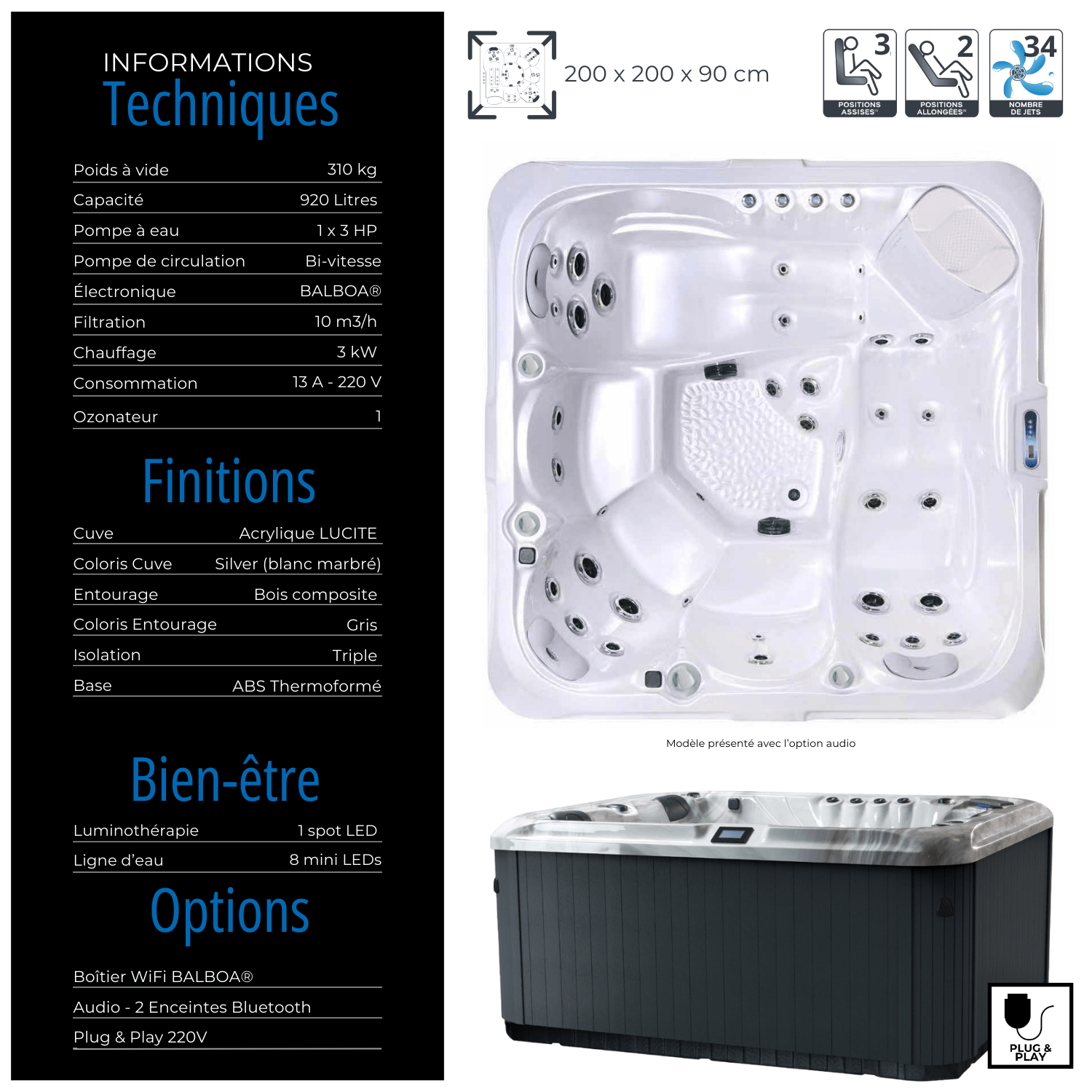 | Jets de massage | 34 hydrojets |